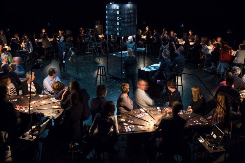 "Cape Ka is booming," our sleek, calmly spoken croupier (Dutch performer Hannah Boer) informed my table-mates and me, as we watched our rating grow from an A- to an A+, all the while swapping bonds and doing our best to avoid the charges of tax evasion that had beset a neighbouring team. Aphorisms abound ("if you want the golf course, you've got to cut the forest"), but such remarks soon give way to ramped-up music and a gathering anxiety as the stakes are amplified and more than one table is plunged into darkness.