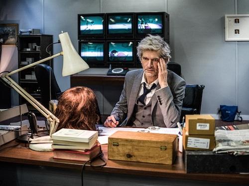 Still, there was plenty to ponder in the splintered narratives it thrust before our gaze. We watched two besuited men, Daniel (Chris Evans) and Martin (Lahav), scurrying the hallways, exchanging well-worn workday platitudes and shuffling papers. “You’ve got until Friday” booms an authoritative, disembodied voice, and suddenly we’re on a rooftop, listening to Daniel’s panicked breathing as he stands, distraught, on a ledge. The pair of supervisors, Louis (François Testory) and Karl (Ryen Perkins-Gangnes, pictured above) speak only in French and German, adding to the sense of dislocation, and they have their own troubles, Louis frail and eventually near-hysterical, sucking on an oxygen mask while Karl struggles to support him. And their interventions to train, or perhaps to cure, their sweating, anxious employees/patients lurched from cruel to tender. Daniel must march back and forth clutching a briefcase, always haunted by the terror of that rooftop flashback. Martin must relive, again and again, his final date with a woman he loved, who told him one night in a restaurant that it was over between them. In one particularly disturbing scene, he was manipulated through the re-enactment with giant wooden rods, a grotesque, helpless, man-sized puppet.