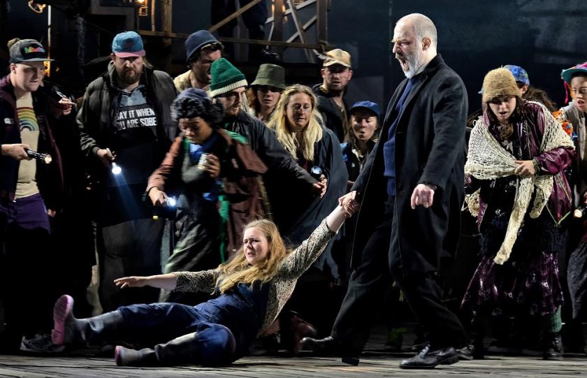 Then you take into account the tremendous commitment of all involved, and you feel a bit guilty for sniggering at excess. Though it takes a long time in getting to the point of who’s lighting the fires to warn ships away from the murderous pack, the drama does deliver, with a central love-duet that does all the right things while not being especially memorable and a final “secret trial” in a cave which pulls one lurid stop after another out with undeniable theatricality (pictured below). The fact is that Ticciati believes in every phrase, and that Glyndebourne has assembled a magnificent cast and the usual chorus of young future stars relishing its presence as a pre-Grimesian Borough, delivering the hate and the fury as if they were up to Britten’s level (they aren’t, and in any case we’re talking about 1906 rather than 1945, but in the moment manner triumphs over matter).