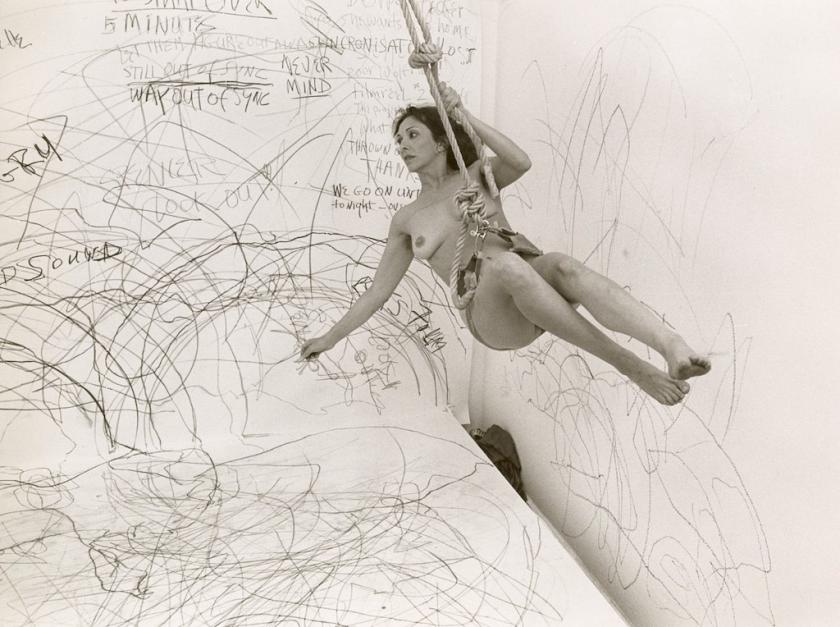 Challenging the status quo, which she referred to as the “Art Stud Club”, was one of her missions and, in doing so, she produced some seminal works. Her response to Jackson Pollock’s drip paintings, for instance, was Up to and Including Her Limits, 1976 (main picture). Hanging naked from a harness, she swung back and forth in a trance-like state, drawing and writing on the sheets of paper surrounding her. Physically and emotionally taxing, the performance explored the limits of her endurance as well as the legal limits of appearing naked in public.