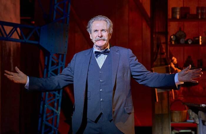 Robert Bathurst’s Scrooge (pictured above with Corey Wickens), his Teddy Roosevelt moustache deserving of a credit in its own right, doesn’t have a great deal to do (there’s but a half-hearted “You boy. What day is this?”) but that turns our attention to the super ensemble and band who give full value to the score. George Maguire doubles as Cratchit and a genuinely evil Marley, singing with his Olivier award-winning skill and confidence. Sarah O’Connor and Danny Whitehead deliver the best ballad, “Three Candles”, as the siblings Fanny and Eben with plenty of charm and there’s a splendid Grand Ole Opry style entr’acte to enjoy in which fiddle, banjo and spoons are prominent.