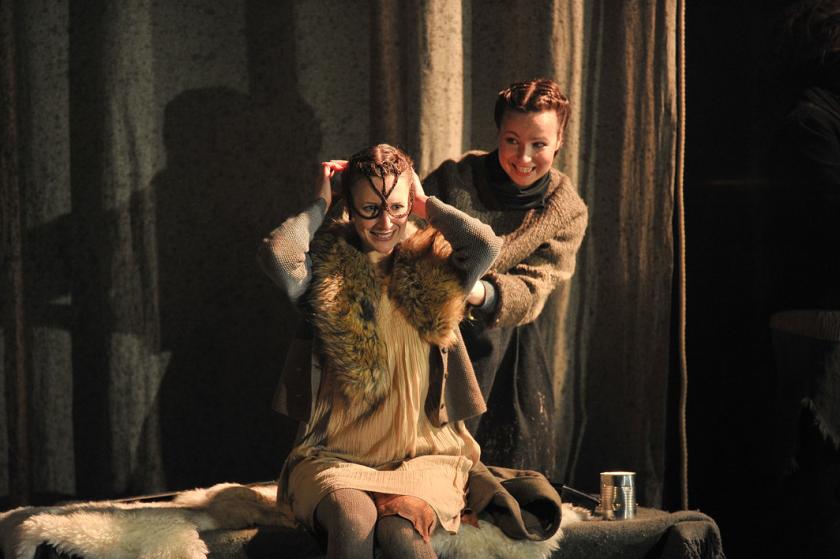 James Bonas’s production is a moody affair, distilling Handel’s Scottish setting down to its emotional essentials. There are hints of snow and of the original sea-coast in Molly Einchcomb’s post-apocalytpic designs that pivot around a series of moving curtains (effective but criminally noisy), creating a wonderfully fluid sense of place. Dark browns, blues and blacks, all flecked with mud, give this tented space an edge, and even the trees are fragmented – amputated boughs suspended gracefully in the air.