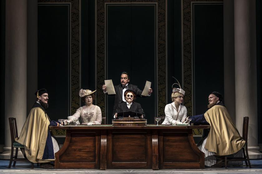 The two officers – and Albanians (pictured above) – are just as finely distinguished from each other as the sisters. As a silkily Italianate Guilermo, Seán Boylan is no more wholly the brittle Casanova than Gavan Ring is the vulnerable poet, though Ferrando’s “Un’aura amorosa” lets the tension sag before the first-act finale, a serenade sung as a soliloquy. All four lovers give youthful and impetuous but fully rounded accounts of their roles.