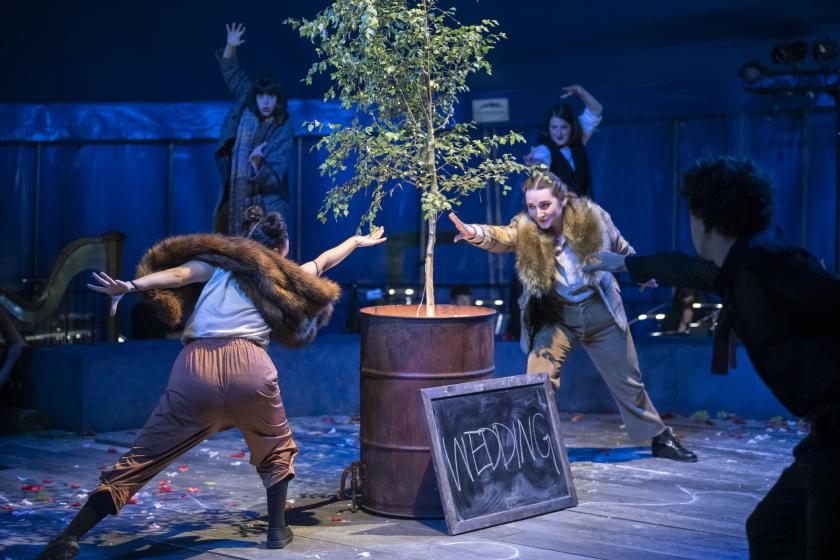 But the real spirit of the production lies in the comings and goings, the creatures great and small (not always clearly identified, but no matter), the cockerel (Lucy Mellors, excellent) and his hens, whom the feminist vixen lectures about their subservience to a conceited male but then proceeds to slaughter the lot of them, and not least the procession of fox cubs in the last act (pictured below with Frances Gregory) (“how many have we had?” asks the fox; “I’ve lost count,” replies the vixen). Which is important, by the way, because the season comes round with a new fox and a new vixen and the world is the same, oblivious of us humans and our anxieties. The aptly named Ms Fuchs handles all this with consummate resourcefulness, helped by Nate Gibson’s economical but witty designs, full of light touches, the scattering of leaves, tables and chairs put to all kinds of use, as one might do, much more clumsily, in some improbable home Vixen. The children are superb; but they would be, wouldn’t they?