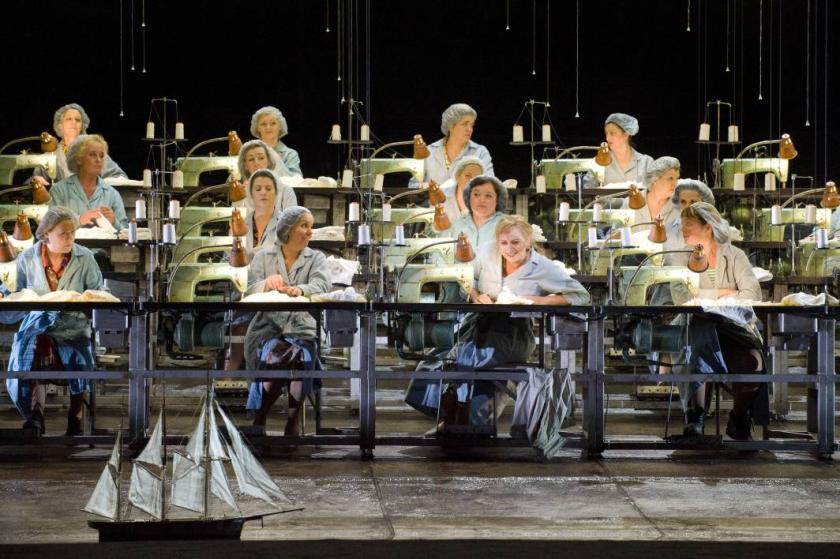 Greeted favourably when it debuted in 2009, the production relocates the folk tale of the arrogant mariner, forever condemned to wander the oceans unless he can be redeemed by the true love of a woman, to a non-specific contemporary setting. While a beautiful three-masted ship is present on stage, this model is dwarfed by the contemporary abstraction of a vessel that designer Michael Levine creates, its sweeping metallic curves by turns cradling the fragile action and then rearing up to hurl the Dutchman and his doomed Senta to their separate fates.