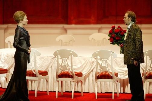 There is, I'd better say straightaway, a problem with director-designer Tcherniakov's stunningly realistic and dazzlingly lit sets. The table chez Madame Larina is placed well upstage, with only a little of the action brought further forward. Even then, and in the closer yet paradoxically more frigid celebrations of the civic red room in Act Three, the singers struggle to be heard above Dmitri Jurowski's pointedly ungraceful conducting of the Bolshoi Theatre Orchestra. These are the same problems of acoustic distancing experienced in Katie Mitchell's ENO Idomeneo, and it's a pity, because none of the voices is small and anything but authentically Russian in technique and projection. Surely the boxing in of the set slightly behind the proscenium arch is to blame.