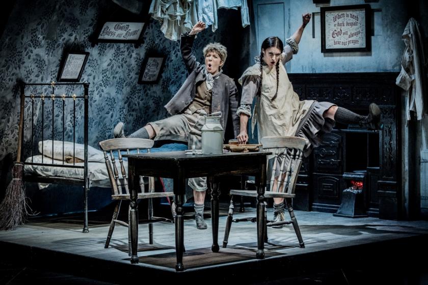 I wouldn’t have known it was meant to be Manchester if I hadn’t read the press release, but no matter: perhaps I should have realized that the name above the Witch’s little housey, here transformed into a sweets and pastry shop – Lecker – would be just right for one run by one of the many German émigrés in the Manchester of the late 19th century. Is the rest supposed to be a dream? Perhaps it is, as the Witch’s Konditorei, emerging from nowhere, transforms – and this really is a coup de théâtre – into a magnified version of the one-room home the children started off in (like in Cats, the larger-than-lifesize sets make you enter another world).