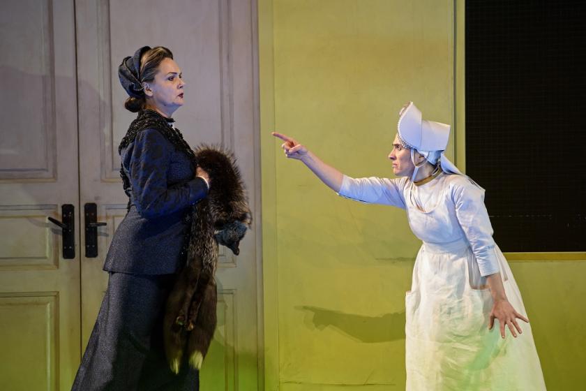 Elena Zilio is back to steal the show with her redoubtable chest tones and rapacious inflections as old cousin Zita, and we have two delightful new young lovers to represent May versus September: Paolo Fanale as a sweet, spunky Rinuccio, bouncing the awkwardly-ranged hymn to Florence with perfect zest, and Susanna Hurrell making her main Royal Opera stage debut as Lauretta (pictured above with Gallo), managing to sing the penultimate line of "O mio babbino caro" in an impressive single breath even given Luisotti's over-lingering speed.