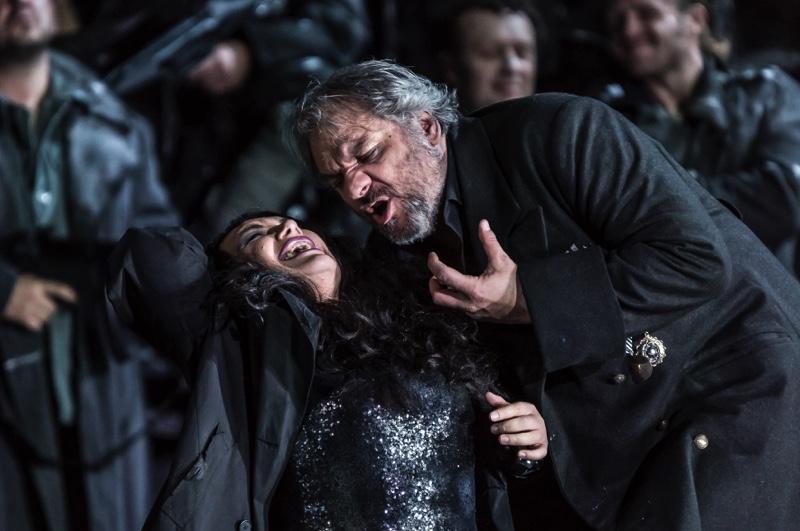 Noseda's is the most impressive approach to Verdi style since Mark Wigglesworth's firing-up of an even more difficult case in the canon, The Force of Destiny, at ENO. Yet where Wigglesworth was dark and deep, Noseda prefers light and springy. There are points in the hell-for-leather conclusions to duets and trios where you might want a little more hell-fire, but the swiftness certainly drives home the incredible daring of Verdi's often elliptical approach to operatic formulas, making a virtue even out of the endlessly repeated ballad-style repetitions of the plot's pre-history: in short, that a gypsy was driven so mad by her mother's burning as a witch that she threw her own baby onto a bonfire by mistake. The set-up is urgently delivered at the start by Maurizio Muraro's captain Ferrando in front of a tank and a questioning male chorus sounding more expressively as one than I've ever heard them (pictured below).