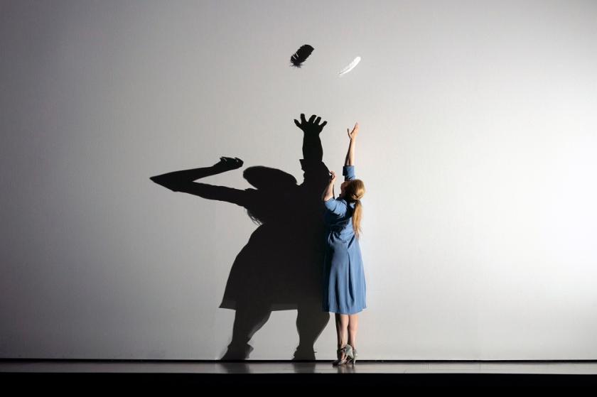 The catching of a feather and the shadow of an angel in the orchestral introduction are beautiful images. The trouble begins when the heavenly emissary is embodied in a young man, and then by eight wingless, beautiful others: so distracting, especially in what should be the heroine’s most isolated moments, or her brief moment of private desire about to be fulfilled (pictured above). And what does Katya take out of the first descending cage? Is it a Magritte owl? A rock? An egg? The symbolism, unclear at first, is as heavy as the giant boulder which Olivier Tambosi used to dominate Act Two of Janáček’s Jenůfa at the Royal Opera (also cued when the girl tells her step-mother that she feels as if a stone’s falling on her).