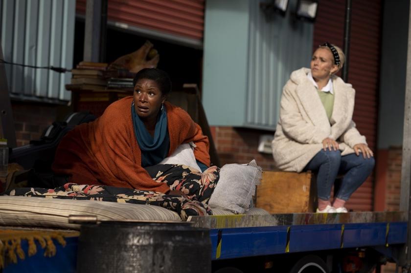 Picture the scene. A vast steel gazebo covers a nondescript parking lot next to an industrial unit in Glasgow. With a clear plastic covering, it is the most rudimentary of shelters, sides open to admit the roar of the M8 and the wailing of sirens, carried on a keen autumnal breeze. About 100 people, all wearing masks, are seated at a random scattering of mismatched but carefully distanced chairs and tables, loosely grouped around a central stage. Around the perimeter, a scattering of tents, shipping containers, and flatbed lorry trailers, one of which is furnished to look like a dilapidated living room in which two men are pottering about aimlessly. Next to it, the huge roller shutter doors of a warehouse are open, with figures dimly visible moving in the shadows.