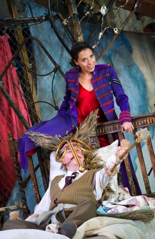In choreography, too, there is some small loss. At the core of the production, Puck, with his acrobatic trumpet and drum accompaniment, is turned from a glib-talking gymnast into a tongue-tied Beckett tramp, error-prone not because over-hasty but because slow-witted. Richard Durden makes this convincing enough, but it slows things down more generally; and in the same way the fairies, their wings clipped, hover rather than flit, while singing with irresistible charm. Slater best achieves movement with his helter-skelter slide for the more magical entrances stage left (including the conductor’s for his curtain call), and in the Pyramus play and bergamask – impossibly stupid and overplayed as always but fun because a release from the toils of magic.