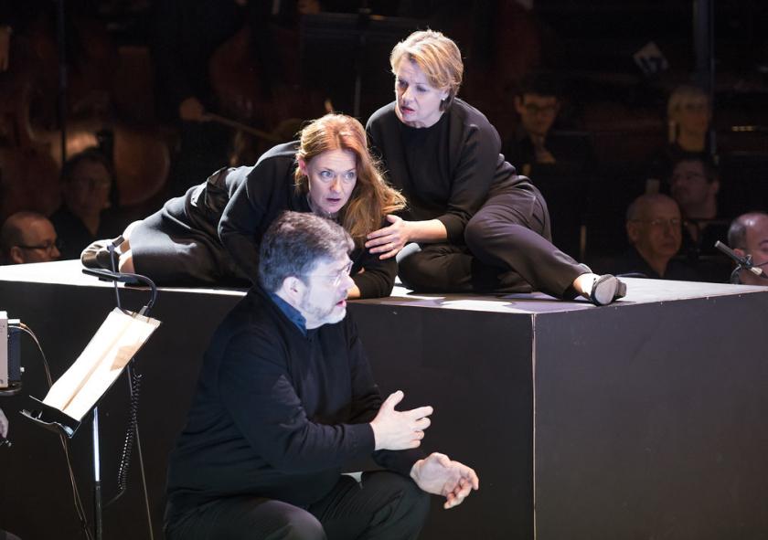 What’s most striking is the reaction of a director whose language is physical symbol, ordered, ritualised gesture, to a drama whose own symbols are already so clearly defined. Aided by an exceptional cast, Sellars’s style softens into a stylised naturalism, finding the human as well as the humane in the story. Even with the clutter of a symphony orchestra on stage, you’re always aware of Gerald Finley’s Golaud (pictured above with Elias Madler and Franz-Josef Selig). His hunting doesn’t stop at the end of the opening scene, but continues throughout as he stalks and prowls, dangerously obsessed with Magdalena Kožená’s Mélisande. This confusion of tenderness and violence is mirrored vocally. Such patrician smoothness and control, such tonal beauty becomes grotesque when allied to the bullying of his son (the astonishingly mature Elias Madler) or his physical abuse of his wife.