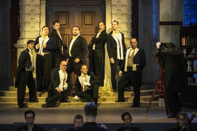 The stakes are so low in this new setting that the ominous curse theme first sounds as a young man is pantsed in a club initiation ceremony – sub-optimal, certainly, but hardly the stuff of tragedy. Matthew Stiff’s Monterone (a bullied Don) must carry off Verdi’s darkest, most tragic music while stumbling about in vest and boxers wrapped up in a coil of bunting. When Act III’s orchestra is giving it the full dark-and-stormy-night for assassin Sparafucile’s seedy inn, we get a cosy village pub complete with hunting get-up for the Duke. Dead bodies disposed of in the Cherwell – it’s more Morse than melodrama.