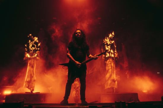 Stagefront are two silhouetted figures, heads at a strange angle. Like hanged men. Beside each is a robed demon sentinel with a burning…