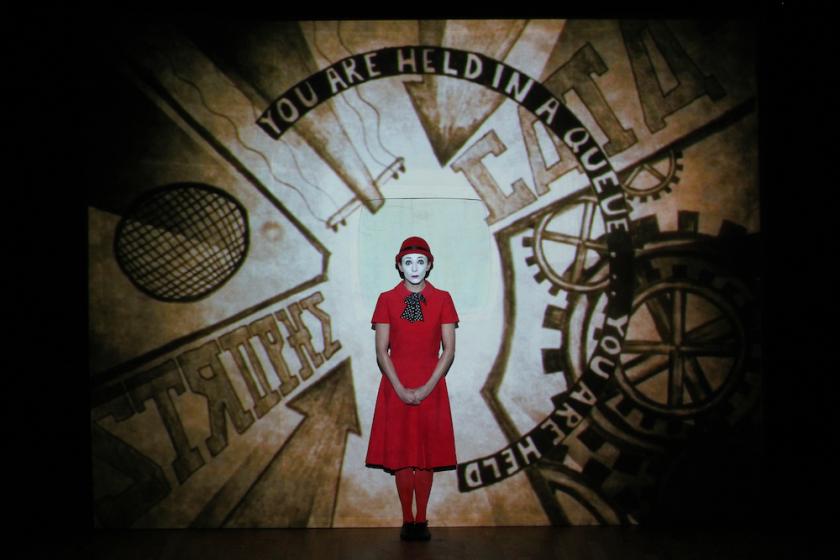 In 70 minutes, this exciting fantasy tale is told using a mixture of only three actors (Genevieve Dunne, Rowena Lennon and Felicity Sparks) and continuous animated projections, to the insistent and lilting sound of music. The effect is truly wonderful: a beguiling atmospheric picture show which conjures up Central Europe of the 1920s, contemporary graphic novels and even a dash of good old English pantomime. Sometimes comedic, sometimes slightly melancholy, the play brings to mind the image of the little person who is pitted against authority, of individiuality against conformity. You are reminded of Charlie Chaplin, or Emile and the Detectives.Both Agnes and the Caretaker are essentially powerless, archetypal little people, yet they must take on the frustrating bureaucratic rules and regulations of power as they cross the city in their quest for little Evie. While the mayor deploys gum drops laced with debilitating drugs (a chemical cosh), the stakes rise as the contemporary significance of this urban fairy tale sneaks into your consciousness. For the story evokes a past when kids were free to play in the streets, when being naughty was inconvenient rather than dangerous. It also suggests that children are still objects of suspicion. Whose autonomy we fear. And, as you'd expect from a company that calls itself 1927, there is a lot of historical resonance in the visual aesthetic: some passages (pictured above) are reminiscent of Soviet-style iconography; others bring to mind the worlds of Franz Kafka or even Kurt Weill; Fritz Lang hovers somewhere on the dystopic edges of this creation.