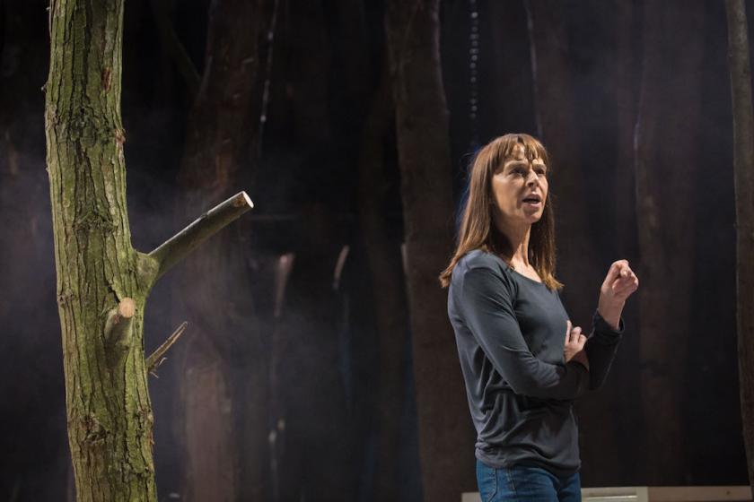 On Camila Clarke’s versatile set, which mixes concrete flooring with dessicated trees, Vicky Featherstone’s haunting and unsettling production frees the staging from some of the constraints of the text: the road trip is not played in a car but across the whole set using chairs and a freezer as props. In the basement scene, she uses a total blackout to subvert audience voyeurism. Her cast, which play two roles each, are uniformly good, although special mention should be made of Kate Dickie’s opening monologue, Mike Noble’s commander, Tadhg Murphy’s sadist and Ria Zmitrowicz as his victim (pictured above). The mixed British accents of the cast — from Liverpool to Essex — give the stories a local resonance whose intensity reminded me, especially in the basement scene, of Sarah Kane’s Blasted. Like that play, Bad Roads brings us sobering news: wars continue to happen because enough men get off on them.