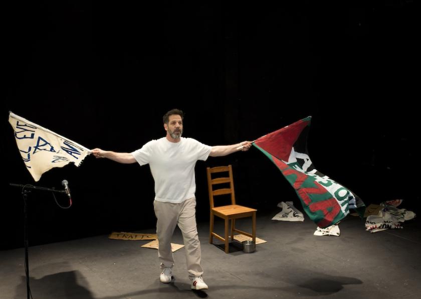 This joke gives a flavour of Yousef’s humour as he remembers the people in his childhood, how he meets them later in life, how they want him to take a stand, to choose a side, to be political. But the play does something less ideological, more humane: it explores the liminal space between sides, and cultures, as Sweid switches between English, Arabic, Hebrew and German. But events are not kind to him: his stance that becomes increasingly difficult after the Hamas attack of 7 October 2023 and subsequent Gaza War. Now, as the disaster explodes and the deaths and casualties pile up, the refusal to join one side over another begins to look like indifference, or paradoxically inhuman. How can you not empathise with your fellow Palestinians in Gaza; how can you not demand revenge for the 7 October attacks?