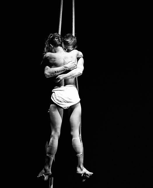 The stage is practically bare – two chairs, a trapeze, gym ropes and a suspended lamp – and begins with the only moment that raised a titter from the capacity audience: a series of tableaux featuring both performers in 1940s suits, aloft on the trapeze. From there they both slowly strip down as the evening progresses, until eventually both are wearing only white pants. To start, though, Stokes sits on a chair, slowly undresses down to a nightshirt, unpins her hair, cleans her teeth, then, to a bleepy electronic soundtrack, shows off stunning rope-work, all muscularity and contortion. It is an intense airborne dance, with intimations of struggle, of fighting and dying.