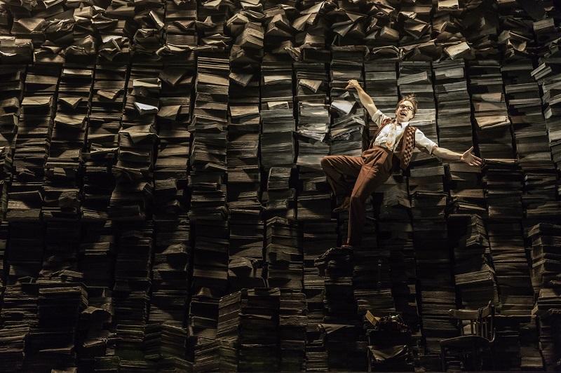 Robert Jones's two-storey design, brilliantly supported by Howard Harrison’s lighting and Duncan McLean’s video imagery, bisects the stage into real and celluloid worlds. The lower, monochrome level is dominated by stacks of film, the upper by piles of manuscripts overlaid with palm trees silhouetted against a lurid sunset or the glitter of city lights. With most of the actors doubling as characters in both narratives, and choreography by Stephen Mear that has all of his usual flavour and flourish, the effect is both dizzying and thrilling; and as the duo who hold it all together, both Fraser and Mutu are superb.