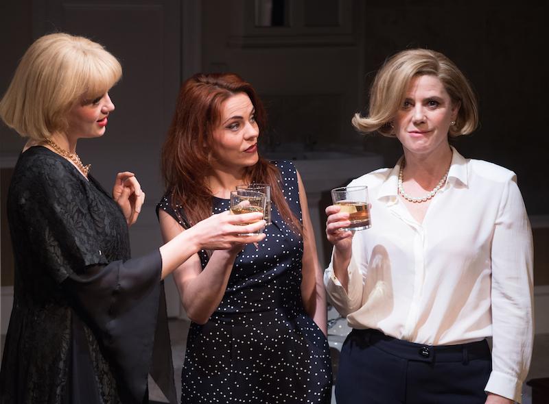 Dying magnate Reece (Robert Portal) suffers an attack of conscience after discovering the murderous methods of business partner Julian (David Bamber) for securing their financial success, and urges dominatrix for hire Poopay (Rachel Tucker, pictured below with Imogen Stubbs) to witness his written confession. When Julian violently attempts to silence her, Poopay flees through the London hotel suite’s connecting door, which takes her back 20 years to 2000 and the night Julian was preparing to bump off Reece’s second wife Ruella (Stubbs). The women hatch a plan to warn fellow murder victim, first wife Jessica (Lucy Briggs-Owen), on her wedding night in 1980 in order to change the course of history.