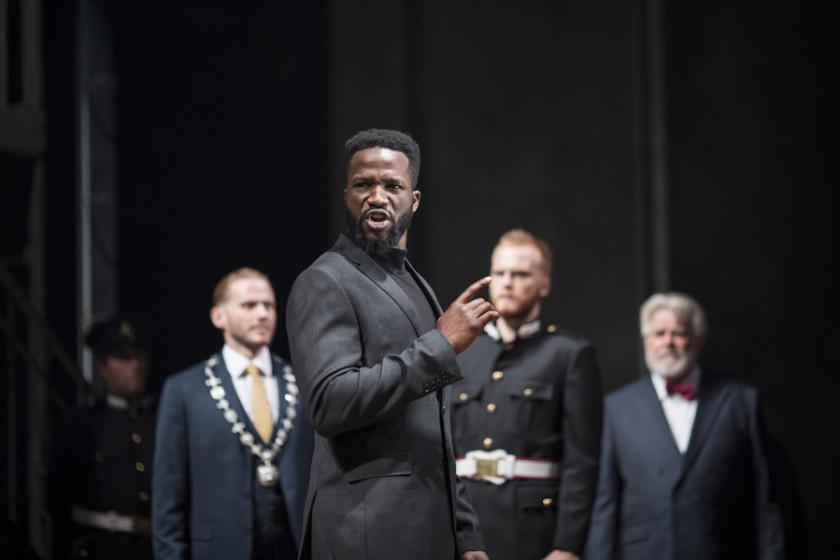 The real problem unfortunately is with Dirisu. There is absolutely nothing wrong with being very young – Dirisu is 26 – but there’s quite a lot wrong with un-nuanced acting. He is a commanding, handsome figure: a warrior, a runner, an athlete… But his monotonous, somehow untutored speaking of the lines is wearing. I kept thinking of Charles Dance, or Ralph Fiennes, or Tom Hiddleston. Against these quite fearsome embodiments, Dirisu comes across as a bit of a boy. He is offset superbly by Haydn Gwynne’s stylish Volumnia, moving and profoundly anguished when, supine, she begs her son not to rout Rome with his adopted Volscian friends.