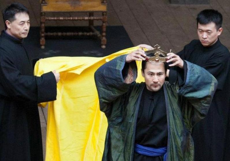 The leading man's graceful gesture was followed by a visibly relieved and happy director (Wang Xiaoying) running up on stage to high five everyone in the 11-strong company (eight men, three women), making their UK debut. Not only had the performers overcome the downpour that has been a feature of the Globe to Globe season’s first week, but the actors beautifully made do without costumes, wigs, masks and props, all of which were reported to be languishing in a tempest-tossed cargo container somewhere off these shores. Colourful posters in the foyer showed how dazzlingly dressed the production was meant to be. As it was, attired in identical black robes with bits and bobs borrowed from the Globe’s stash (where there is always a crown to be had), the performers instead were forced to look to themselves to delineate characters sharply enough so as to impress the non-Chinese spectators – at a guess, about half the audience.