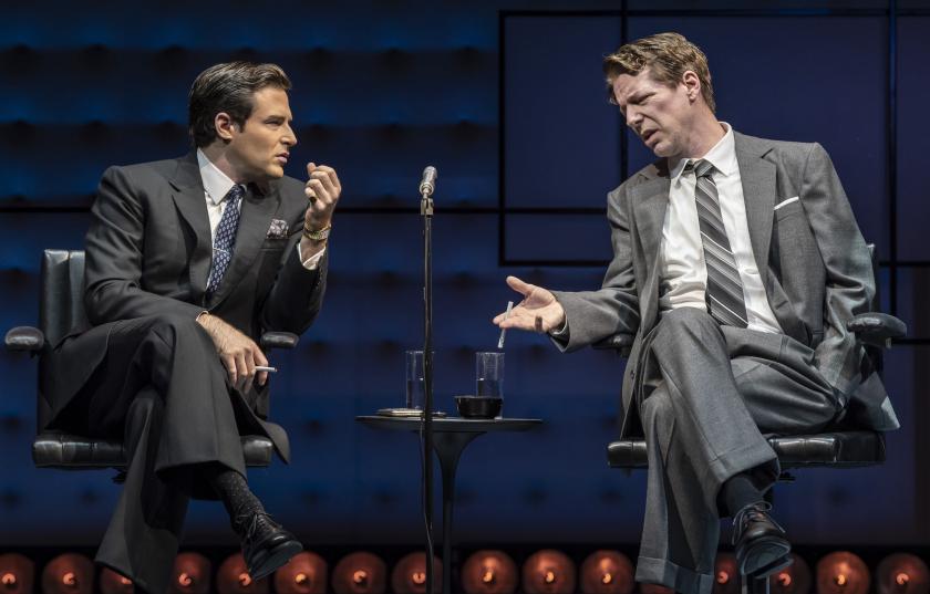 This is also a very “American” piece, citing names forgotten or little known here, such as bandleader Xavier Cugat and pioneering chat-show host Steve Allen, not just Levant, or, for that matter, Paar. That’s not a problem, as the play’s core issue of what you can and can’t say in the media is as potent as ever. Even so, Wright has felt obliged to shoehorn in a lot of expositional material about Levant and other luminaries of the time, some of it a tad ham-fisted. And especially when he uses an invented character, Max (Eric Sirakian), an over-excitable studio assistant with a clipboard and an annoying level of fandom, as a human megaphone to relay all this information.