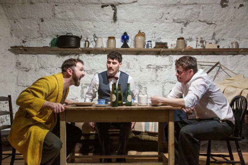 Jim Roche's comic roaring turns nasty in slurring Leopold Bloom, whose Jewishness he maligns; gives another nuanced performance, by Danny Kehoe, as a quiet man goaded to confrontation (the topicality will always be there). Shannon resurfaces, blowing the dust off a big book, as a second narrator. This drama could be filled out on its return, but it's already rich indeed for its short running time (pictured above in rehearsal: Roche sans eyepatch, Flitcroft and Hourican).