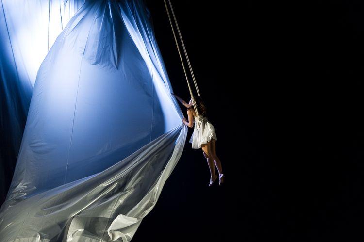 Things started with a voiceover: “One day a man was waiting for something somewhere and he died but he kept on breathing.” This Beckett-ian opener hinted at what was to come, but first was the only sequence to rouse untrammelled laughter. Behind a large, rectangular glass screen, three women tried to resuscitate a man using CPR, all in silhouette and in clownish fashion. From here, however, things immediately moved sideways. Boitel, topless, is lowered up and down on a trapeze, wrapping a sheet about herself, then, as the six strong cast scuttled about like flitting phantasms in the darkness, things took a turn into the sinister, with very occasional glimpses of light.
