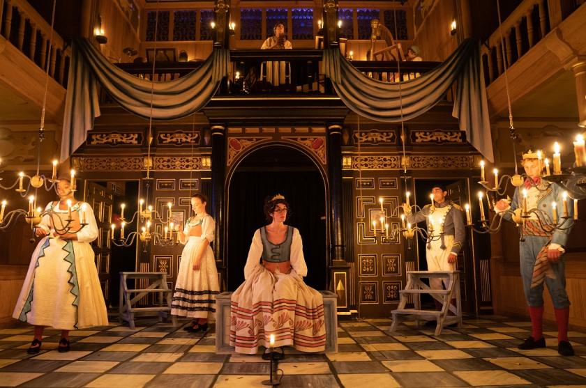 There’s nowt wrong with a romp, of course, though you’re left with the impression that the place for this one might have been the wide-open space of the Globe’s main stage. But Bagnall’s production, with its conceit that the action unfolds from within the Princess of France’s dressing-up trunk and other elements more suited to the gilded finery of the Playhouse, rather falls between two stools. There are music-box allusions too, and co-composers James Fortune and Laura Moody offer a rather lovely score, albeit one that sometimes seems to have only tenuous relation to what’s going on beneath the musicians’ balcony.