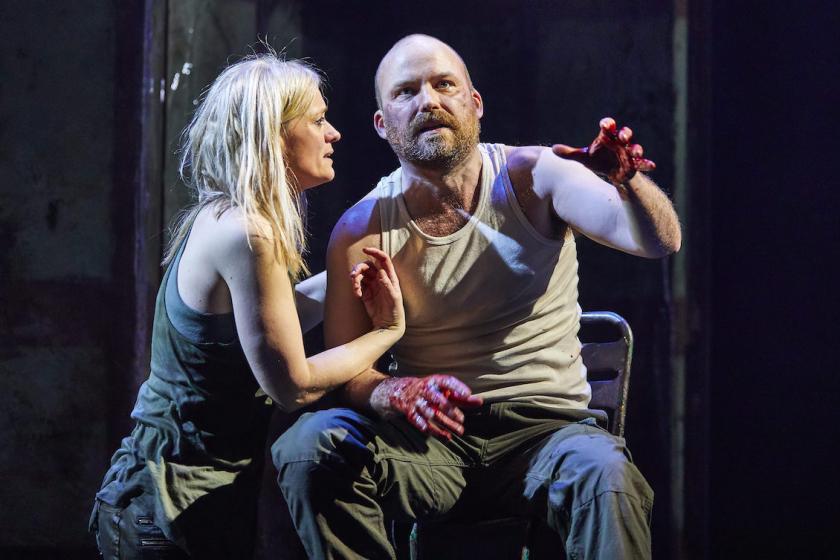 Fair is foul and foul is drab, gory and tricksy in Rufus Norris’s first stab at Shakespeare direction at the National Theatre, Macbeth. It embodies the play's most clichéd quotation (the one about sound, fury, and nada), though whether that's intended as a joke is hard to work out. Lovely Rory Kinnear plays Macbeth like a third Mitchell brother from EastEnders, bullheaded and thick-necked, all short jabbing breaths, strapped into his jerkin with parcel tape. His castle is a pile of old backpacks and broken chairs in a grotty shed reigned over by a starved-looking Lady M.