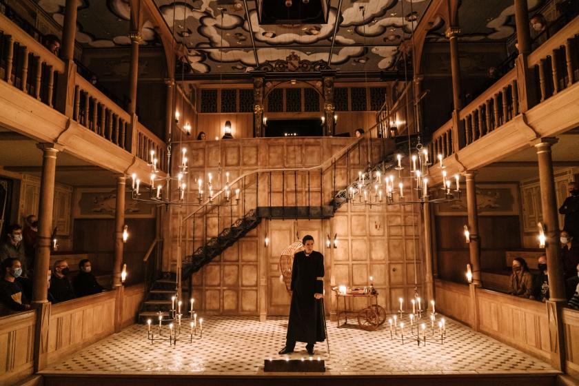 McIntyre’s real subversion, however, is to cast Hattie Ladbury in the central role of the Duke, here presumably Vincentia, a gender reversal that brings a range of revelations with it. And such revelation really is welcome, because the main problem with Measure for Measure remains the Duke, this figure of indisputable public authority so keen to evade the limelight (his “I love the people/But do not like to stage me to their eyes” a hint ahead towards Coriolanus?). The character’s most evident delight lies in the often cruel craft with which (s)he manipulates the main players. The part surely harks forward to The Tempest’s Prospero (a role more frequently gender-reversed), and there are a number of moments in McIntyre’s production when Ladbury – alone, stage-front, whether as Duke or in disguise as the Friar – feels she really might be Shakespeare’s final magus (main picture). But Prospero has the magic, and is bowing out, while Vincentio, relying on human means, returns to pick up the reins.