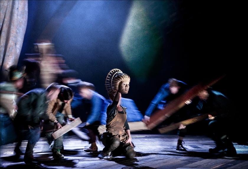 But it’s the Handspring component which offers the biggest pleasures. The wood is planks manipulated by the company and magically transformed into moonbeams around Titania’s head; what a shame more of their tapping and self-made music wasn’t allowed to be exclusive of the soundtrack. Puck is a waggy-tailed creature made up of discarded bits of metal and wood the fairies may have found left behind by humans in their domain, and voiced as well as manipulated by three of the hard-working actors’ team of 12. That rather rules out a strong epilogue – the play ends instead with a musically cheesy fairy parade – but mostly works well.