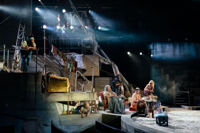 The cast of 'Paradise' at the National TheatreThe original Philoctetes was trapped on Lemnos, whose more recent history as a refugee landing ground finds various references across the stage and throughout the text. The chorus talk about being stuck in camps because they haven’t got any papers; Odysseus stole the documentation that would get Philoctetes back home. Tempest’s unnamed island has been sold out by its government to a prison company, so the women of the Chorus have nobody to rely on but each other. They roll their eyes when Philoctetes finally deigns to speak to them after a decade of living on their doorstep, but they’re still kind to him.