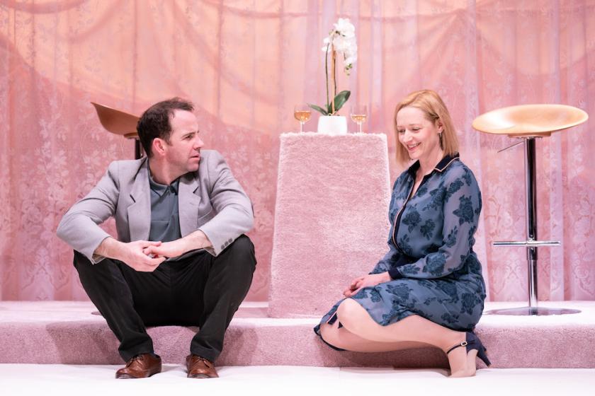 Jes has decided that they will have sex again tonight. Because they are not prudes, they will have sex in front of an audience in the lovely warm surroundings of this studio theatre, which has been turned into a cosy boudoir: thick carpet underfoot, fancy drapes and a mattress with two pillows. Atmosphere: nice and pink. Thank you, designer Fly Davis. The emotional coolness between them is neatly conveyed by the distance between the two stools on which they perch as they talk to the audience. Two bottles of white wine are on hand to help them relax. It’s a provocative set up. So, what’s stopping them?