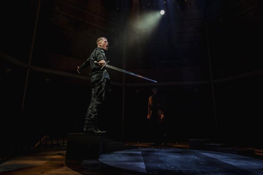 Richard Kent’s design, by contrast, is simple but elegant: a bare black circle with two sets of steps. At its centre is what appears to be a giant USB port but is actually a stool shaped like a chess piece, moved around and sat upon. The costume design is pared back as well, a medieval-modern fusion, with lots of leather trousers and swirling gowns (which don’t count as history, according to History; shows what he knows). There’s a poignant moment towards the end when History straps on Richard’s armour for him, ready for his last stand.