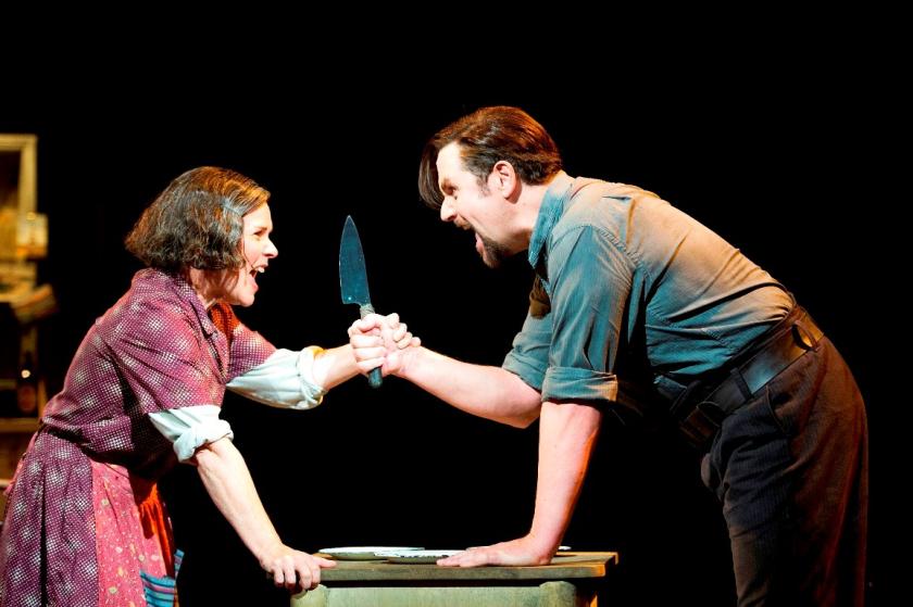 Mark Henderson’s genius smoky lighting fixes and focuses our attention as the action dots and darts about Anthony Ward’s splendidly grim industrial set, which gestures towards, perhaps, a semi-derelict warehouse, while his 1930s costumes update the original Victorian Sweeney to a Depression-era world, making sense of Mrs Lovett’s poverty, and the many drifting men who, unremarked, go missing after visiting the “tonsorial parlour”. Director Jonathan Kent keeps the complex action moving elegantly across the stage, using all three levels of Ward’s set to good effect as he marks out Sondheim’s shifting rhythms.