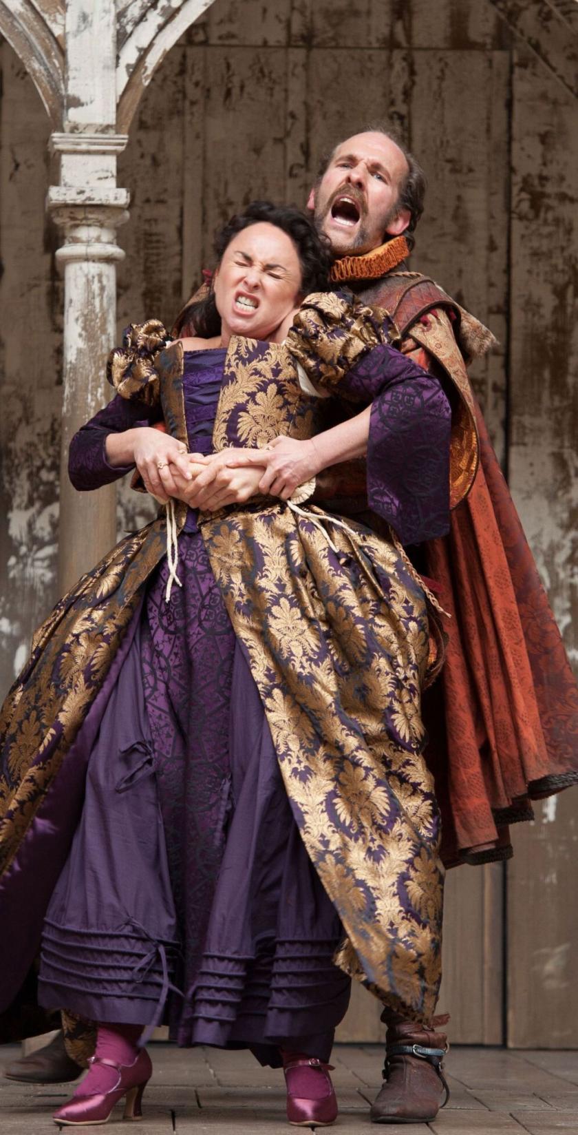 That the staging also finds uncommon delicacy in a play that can seem as "cursed" as its eponymous heroine speaks to the dream team of Samantha Spiro (pictured below, mid-taming) and Simon Paisley Day as the shrewish Katherina, or Kate, and Petruchio, the swaggerer who manages to tame her. A piquant match who throw themselves (sometimes literally) into roles that can look like dry runs for Beatrice and Benedick in Much Ado, these performers look to do for the current Globe repertoire what Eve Best and Charles Edwards accomplished at the same address last year in Shakespeare's later, more mature comedy. When it comes to astute couplings, this is becoming one of the savviest addresses in town.