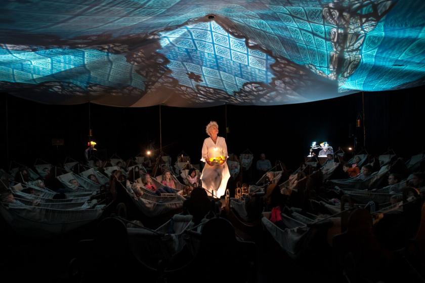 Just when the bairns are starting to get restless, we finish off the day with another blessedly bite-sized performance (none of the shows we see run for longer than 45 minutes). This one sees us hanging in our own nest of hammocks, as a Danish storyteller with wild white hair gives us an excellent rendition of Androcles and the Lion (main picture). Teatret Gruppe 38 have perfected the art of the legend, creating a warm, intimate, safe space to lie back and gaze at projections on the ceiling as we listen to the ancient tale.