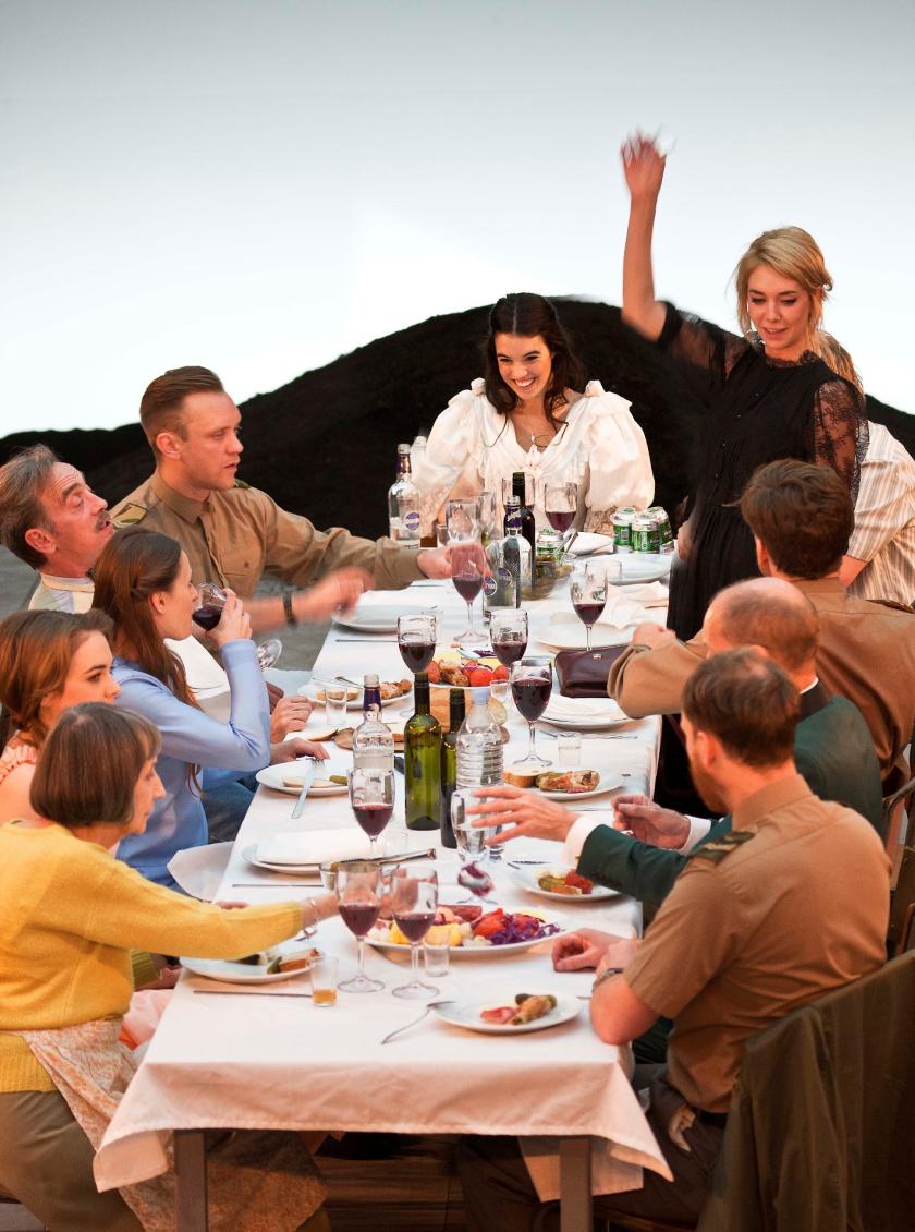 Movement is so free and easy in the first two acts, the hope for something better so vibrant, that you almost overlook the sisters’ physical distance from one another across the vasts of grey tables that represent the floor of the Prozorov house in Johannes Schütz’s chilly design. As the tables are slowly removed during the catalytic night of the town fire in Act Three, the women are forced closer even as they begin to feel their isolation the more, ending up huddled together on the earth mound at the back wall of the acting space.