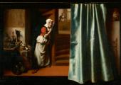A young woman sits sewing (pictured below right: Young Woman Sewing,1655). She is totally immersed in her task, and our attention is similarly focused on her and every detail of her environment. The cool light pouring though the window illuminates her work and also gives us a clear view. She sits on a wooden platform that raises her above the cold floor tiles; on one side of her is a linen basket and, on the other, an ebony chair, its carved back and legs picked out with gleaming dots of light.