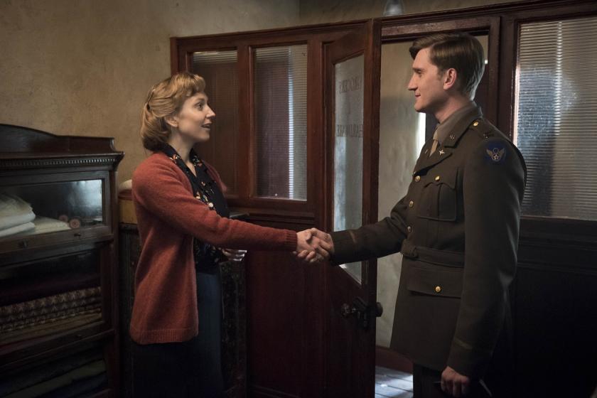 The mother is Mrs Rose Coyne (Hattie Morahan), a well-educated Englishwoman who for reasons as yet unrevealed finds herself married to the publican, running the village shop and bringing up two children a long way from whence she came. Her husband Michael’s rugged good looks were presumably the lure. It’s pretty clear from this opening episode that those good looks may not be enough to keep a loving marriage afloat. It looked to be holed below the waterline the moment a polite liaison officer Captain Dreyfuss (Aaron Staton, formerly of Mad Men) from the air base knocked on her door and started quoting Tennyson at her. “Gosh, bit of a favourite of mine, that one,” she said, her eyes greedily widening as if ther shimmer of an oasis on the desert horizon.