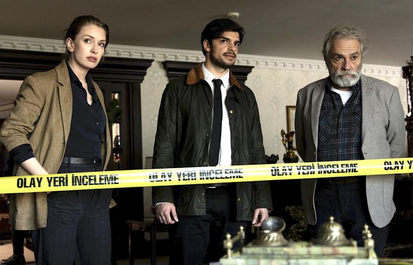 I wouldn’t bet on them feeling the same about the TV version. The plot-driving device is the arrival in Istanbul of Detective Mehmet Suleyman (Ethan Kai from Killing Eve), who finds himself falling under the eccentric wing of Inspector Cetin Ikmen (Haluk Bilginer). Ikmen is a grizzled veteran who doesn’t do things by the book but does them his own way, unlike, for example, Maigret, Luther, Sherlock Holmes, Rebus, Sarah Lund, Jack Regan and virtually every other detective on television. Suleyman is returning to his Turkish roots having grown up in the UK, where he’s been serving with the Met in London, where they apparently thought his name and his face didn’t fit. Conveniently for the Anglophone viewer, Suleyman’s new Turkish colleagues all want him to converse in English (pictured below, Dilan Gwynn as Leyla with Mehmet and Ayse).
