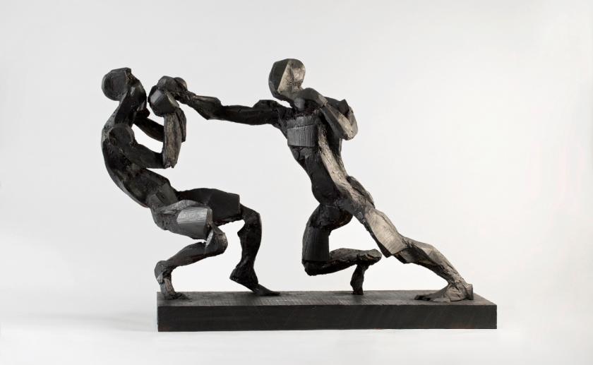 The scultptures in question, which are on show until 9 June, are by Sophie Dickens, and feature various figures in various sporting attitudes. A pair of curlicued Graeco-Roman wrestlers sling each other through midair in a kind of aggressive ballet. Two fencers, each marooned on their own plinth, lunge and parry. A boxer hurls a powerful glove at a cowering opponent whose balled fists shield his face (main image).