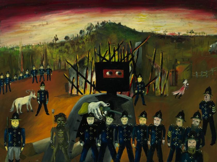 Talk, for the first time, of an Australian tradition began with the Australian Impressionists who worked out of doors. Tom Roberts’ A Break Away, 1891, shows a quintessentially Australian scene of stampeding sheep in a parched landscape being rounded up by a heroic, horse-riding stockman. Modernity was to be summed up in the honed and architectural renderings of the building of Sydney Harbour Bridge that, after the Great Depression, became a symbol of hope for many. Some, such as Margaret Preston, did display in her landscapes a sensitivity to indigenous art, while others, such as Sidney Nolan, began to create new Australian narratives through the use of folklore and local legend, as in his famous series based on the Irish-Australian outlaw Ned Kelly (Main picture: Grenrowan, 1946).