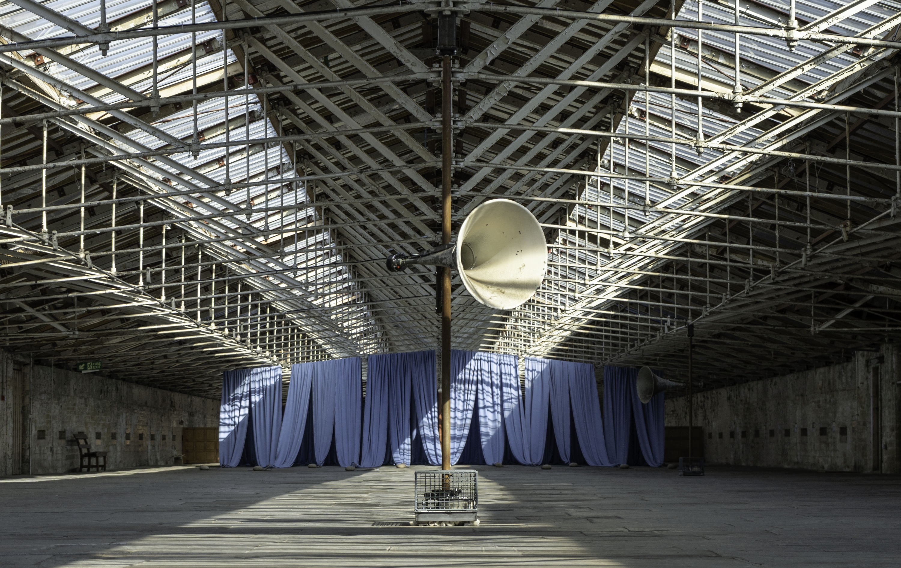 Hamilton has managed to complement this desolate setting with three antique speaker cones, which revolve on rust-coloured supports. The mill’s top floor resounds to the plaintive sounds of unaccompanied solo folk song and cultivated melancholy whistling. The cones, surely not that different from speakers once used to call local workers to their work, lure the present day visitor and, when turned towards you, drown you with a kind of mournful energy that is hard to shake. Further elements in further spaces includes newspaper pages hung on stillage frames, a series of floor-to-ceiling drapes printed with photos of tiny ceramic dolls once used in cake decor, and a lively broadcast shack from which a volunteer reads texts carefully chosen by the multimedia artist.