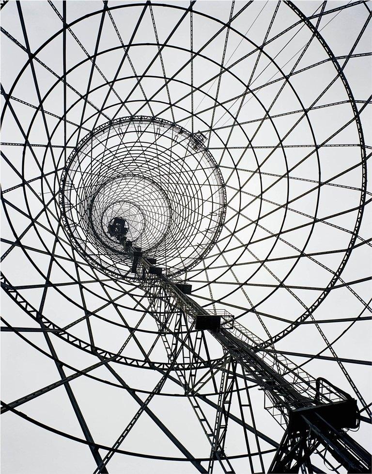 They are, however, almost (almost) cast into the shade by Richard Pare’s vertiginous photograph (main picture, above) of the first permanent industrial structure to be built in Russia after 1917, the Shabolovka Radio Tower, designed in 1922 by Vladimir Shukhov. Its elegant steel trussses floated high over the still low-rise skyline of Moscow, and the archival images (pictured below, Havski-Shabolovskii residential block, with Shabolovka Radio Tower, photographer unknown, 1929, Dept of Photographs, Schusev State Museum of Architecture, Moscow) and Pare’s extraordinary interior shot show how stark its modernity must have appeared at the time.