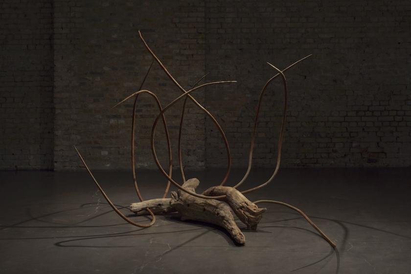 In Ineligible for Death (main picture) two chunks of driftwood rest across one another like the heavy limbs of lifeless bodies. Penetrated by loops of curling iron, they lie pinioned on the floor as if dredged up from the sea bed where they’ve rested for millennia. To heighten the sense of prolonged decay, the artist immersed the sculptures in the Mediterranean and allowed seawater to corrode and corrupt the materials until they resemble the remains of a shipwreck.