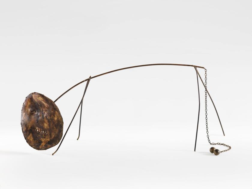 And it’s in this first room that the interplay of intellect, emotion and invention achieves fuller expression with chiefly smaller, more personal works. It’s less coherent, but more fascinating for the fact that it provides glimpses of the many artistic directions he took over the course of his life. In the painting Untitled, 1953, a chorus of upside-down ultramarine Ys thrum in proximity; the different sections of Arabesque, 1955, typified by dots and squiggles and curls, read like visible notation. Both examine how the organisation of individual marks orchestrates larger dynamics. Other pieces invite reflection with levity and tenderness. A glompy lion with a double-balled tail (The Lion Friend, 1960, pictured top), is equal parts atavistic fear-object and friendly psychopomp; a whisked filiform whirlwind topped with a small rectangular looking glass called The Uneasy Conscience, 1973 literally reflects its viewer in its own unsettled image.
